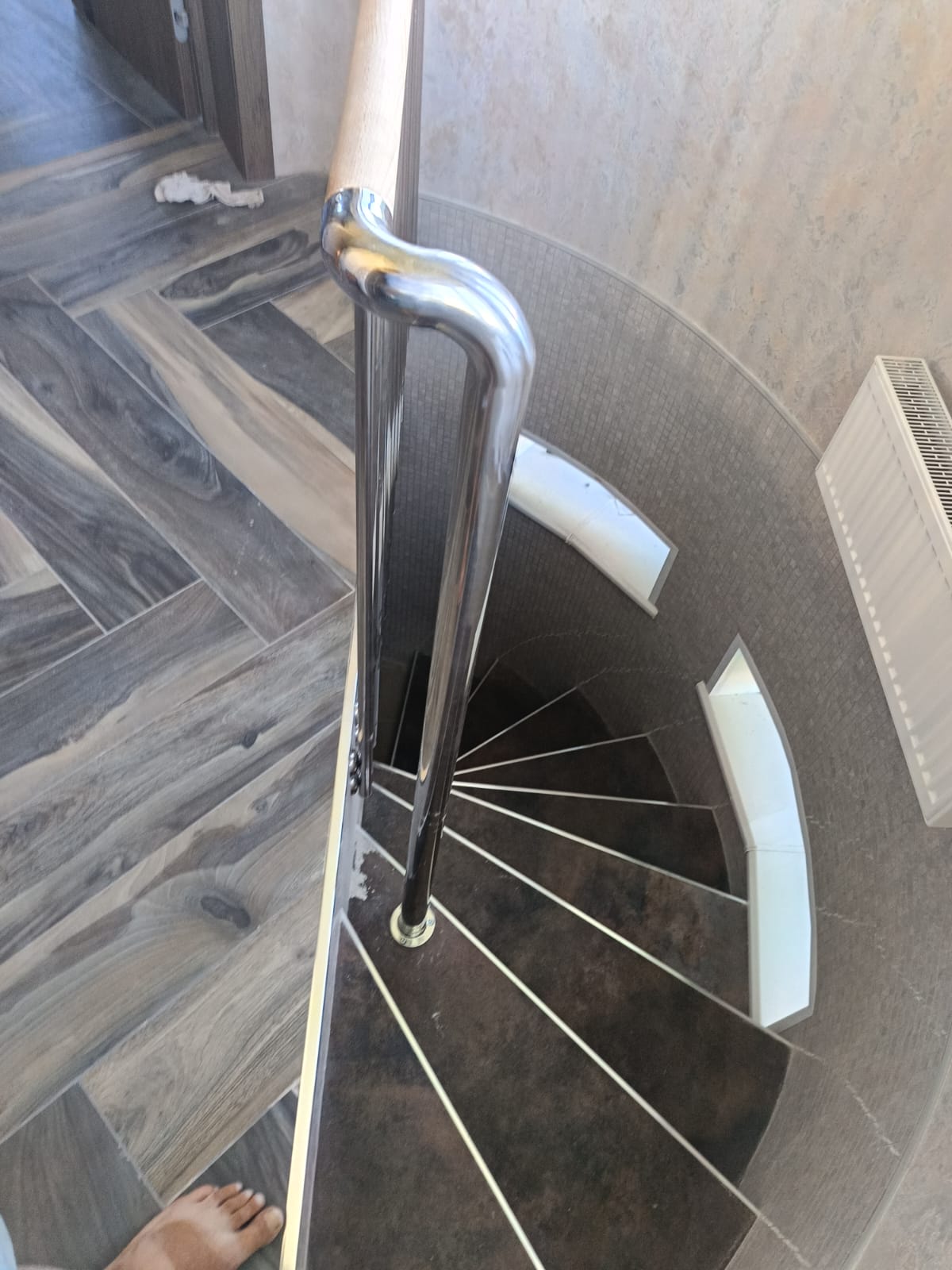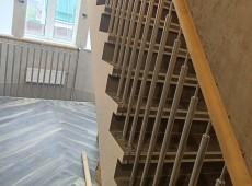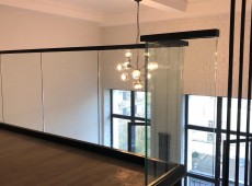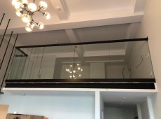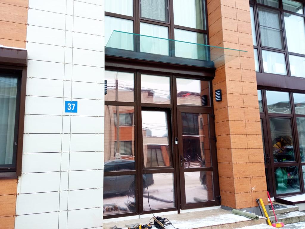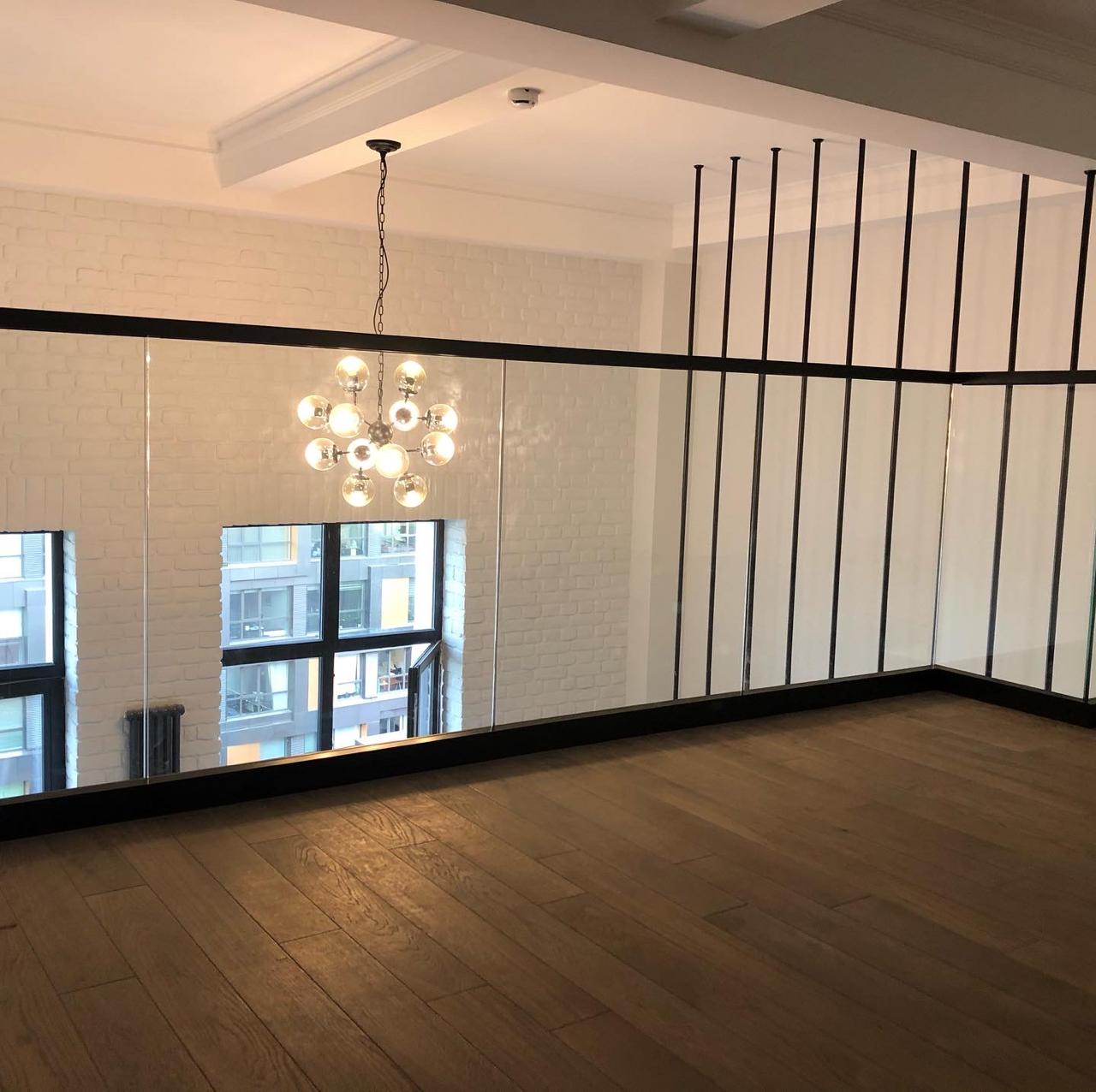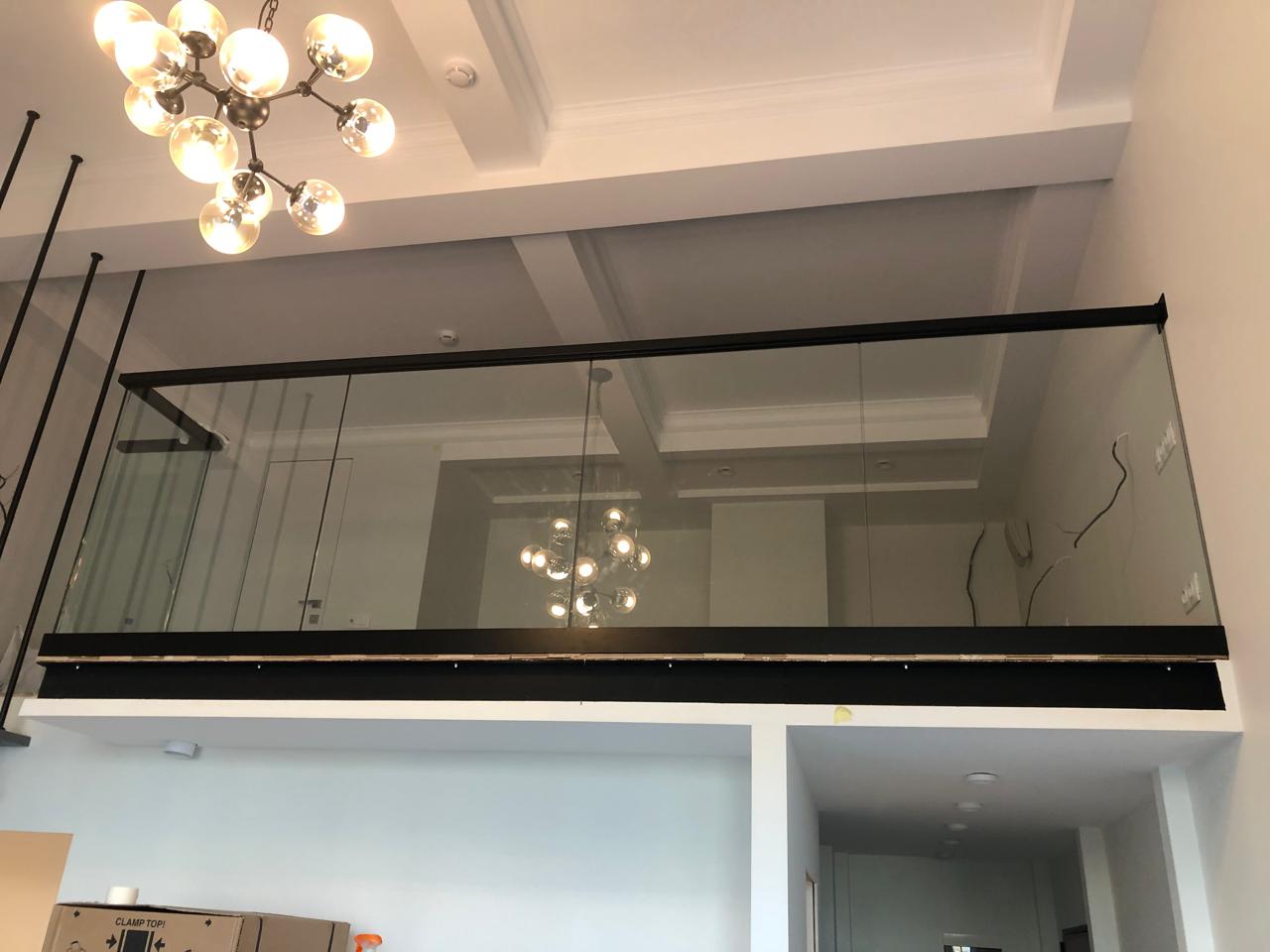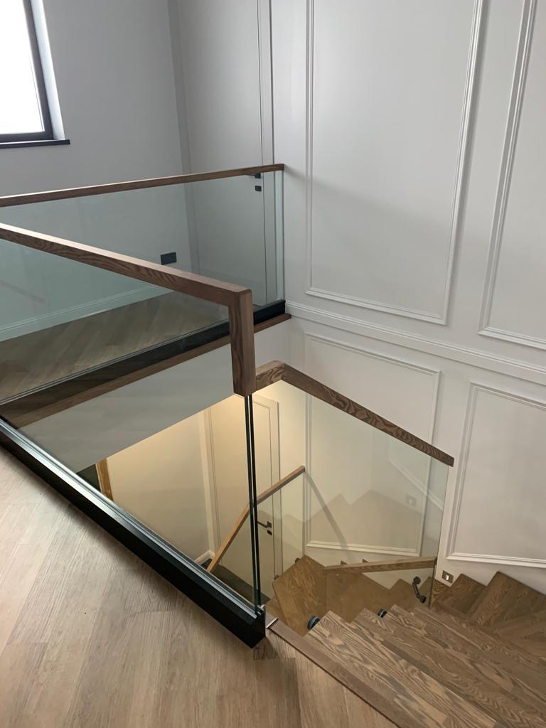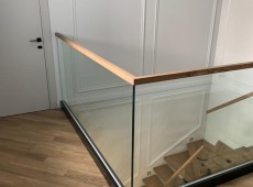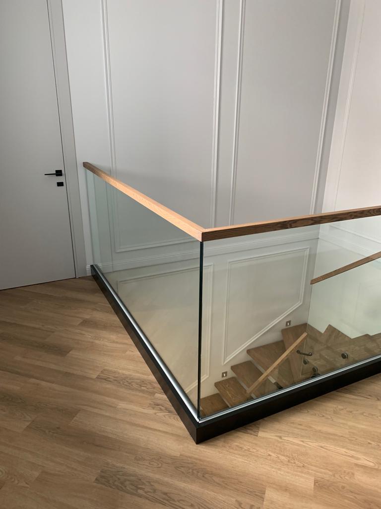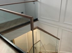 Видео цельностеклянного ограждения с деревянным поручнем черного цвета.